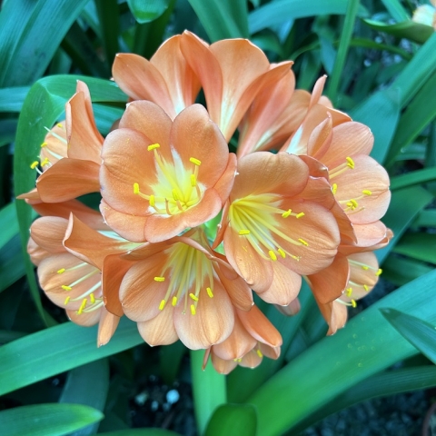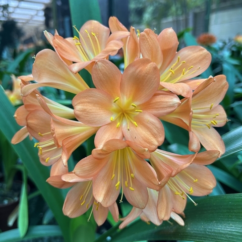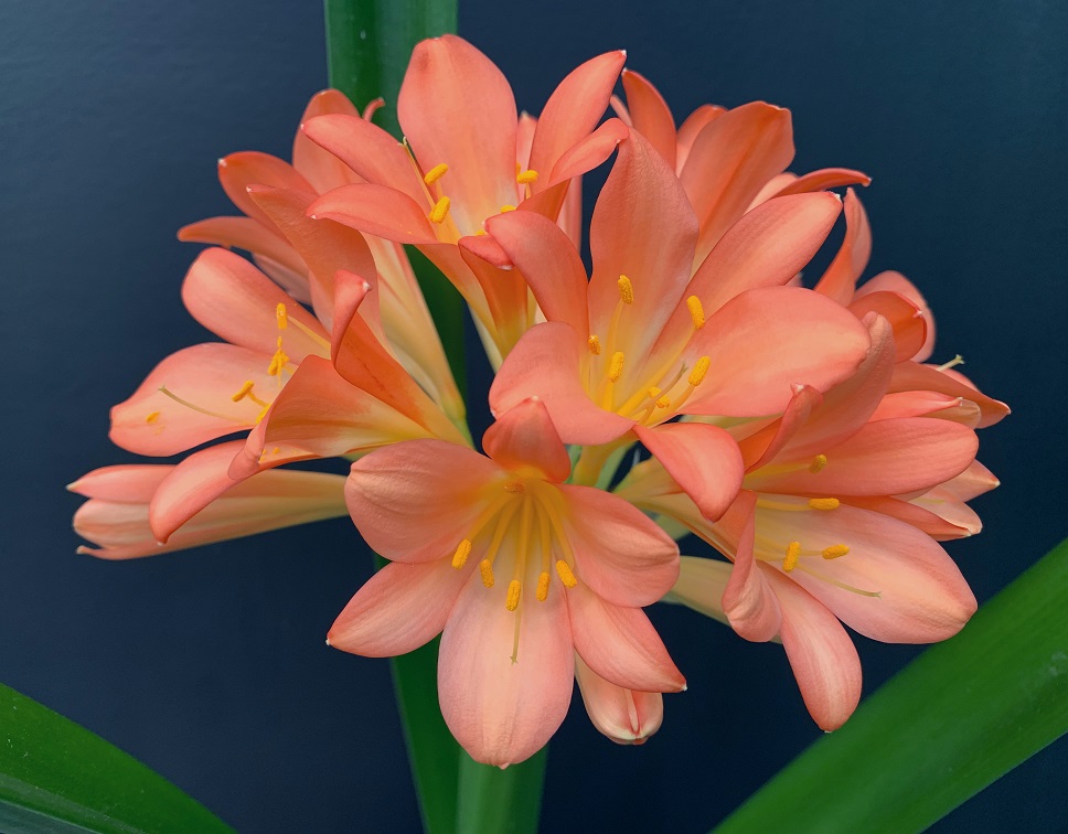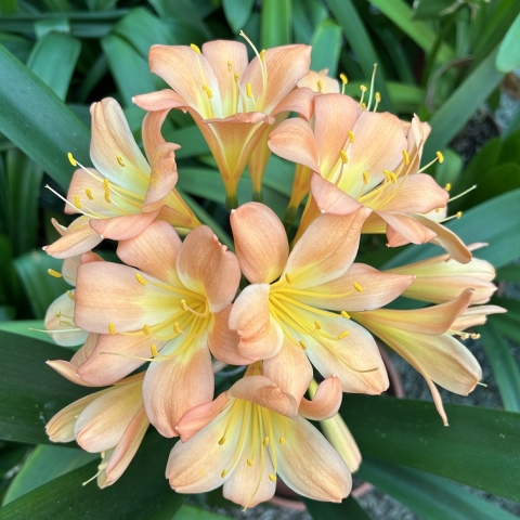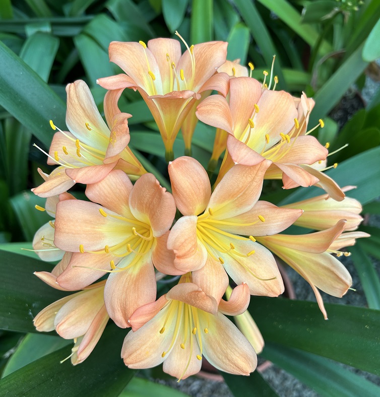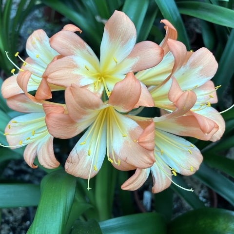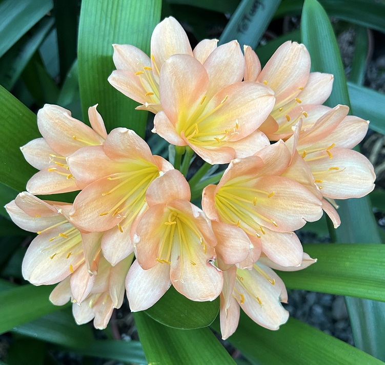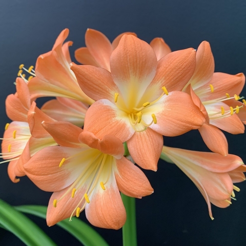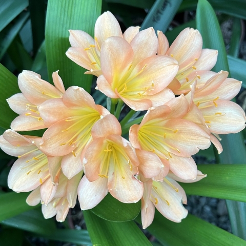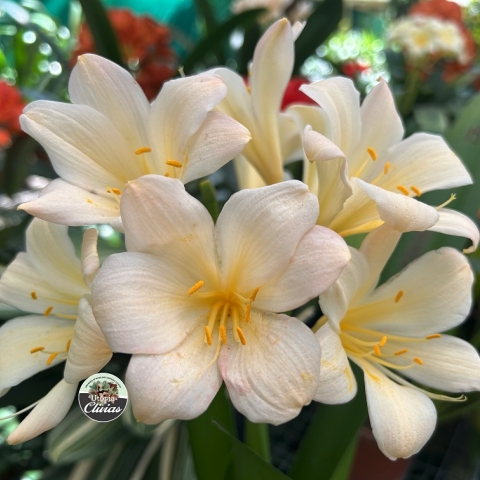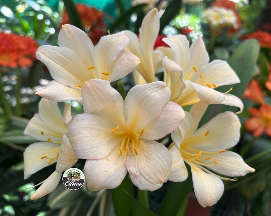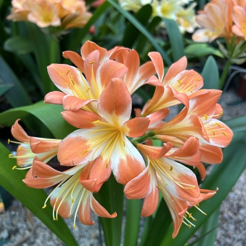 Crème Brûlée – Awarded Best on Show at the Clivia Society Virtual Show 2022 and BOS at the GRCC Virtual Show 2021. A premier bi-colour with a full umbel, pristine white throat, and large recurved blooms, with excellent breeding value.
