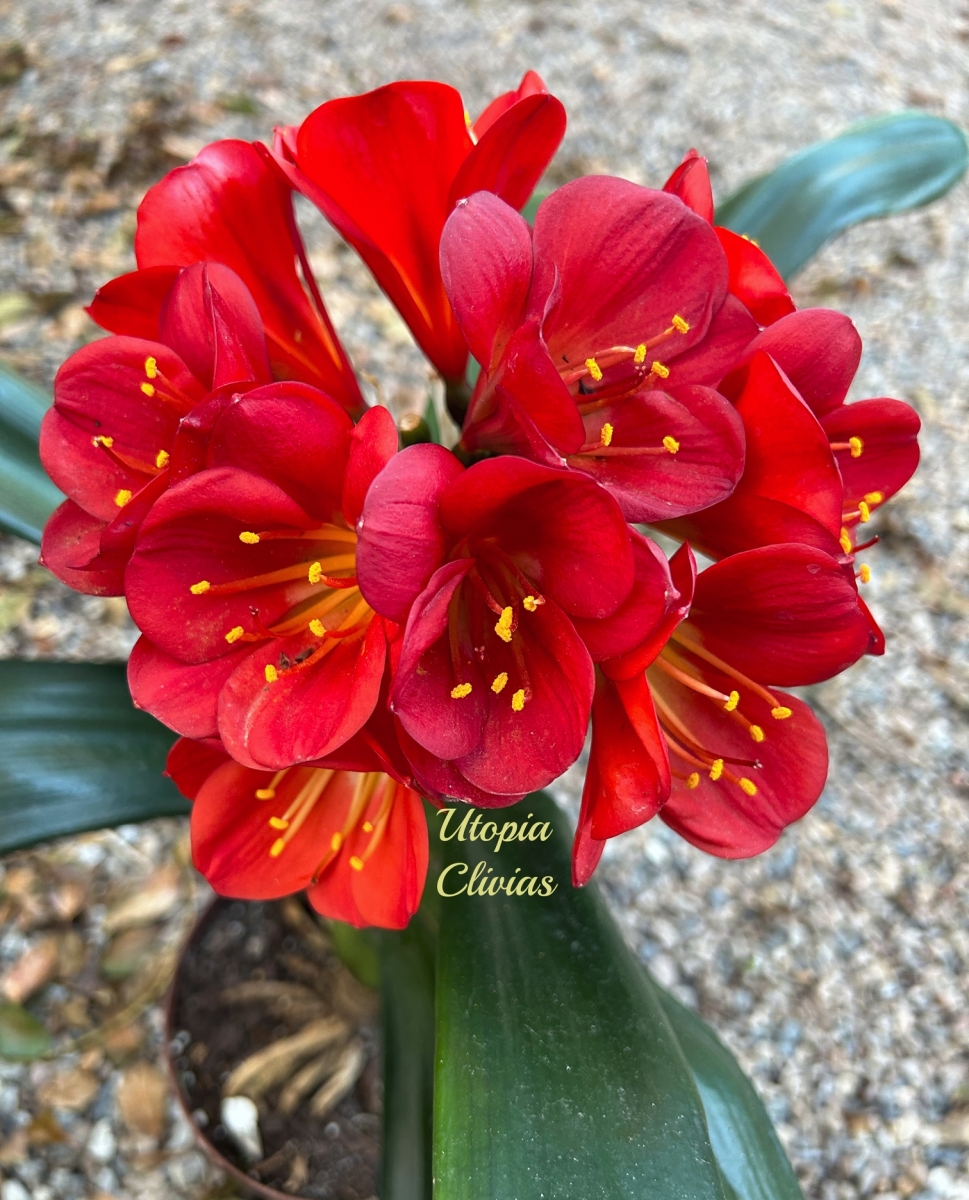 We are also proud to introduce a new line of bronze-red Clivias, the result of crossing our best reds with bronze varieties. These hybrids produce stunning, unique tones that blend fiery red with metallic bronze undertones. One standout example from this line is: